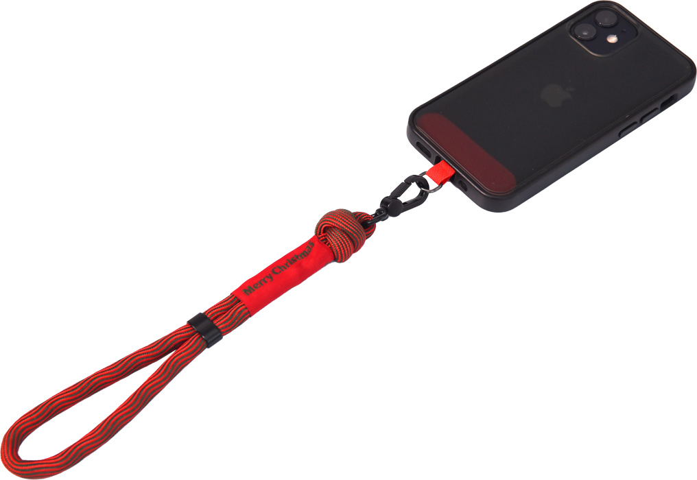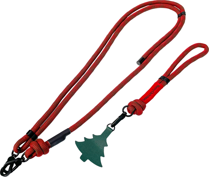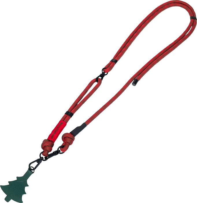 Kordelkette, Schlüsselanhängerschlaufe und Handykette in einem. Längenverstellbar – dadurch als Umhängeband vor dem Körper, seitlich über der Schulter oder quer über den Körper tragbar. Smartphonehalter - hier in Form eines Tannenbaums - im Wunschdesign.