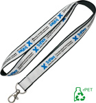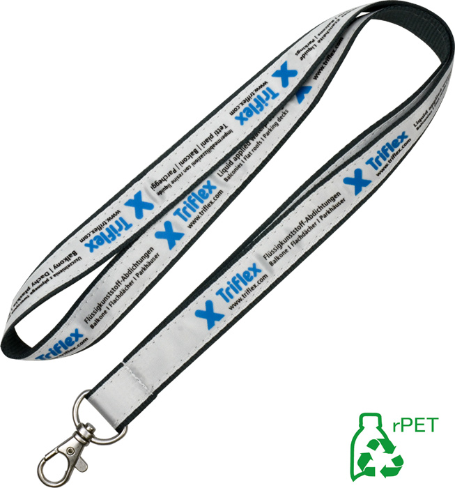 Edles Promotionband aus recyceltem PET. Durch das etwas breitere Unterband erhält das aufgenähte Polysatin-Motivband einen farbig abgehobenen Rahmen. (Ab 3000 Stück ist auch das aufgenähte Polysatinband aus rPET-Material) Empfehlung: für die größtmögliche Sicherheit empfehlen wir die Verwendung eines Sicherheitsverschlusses