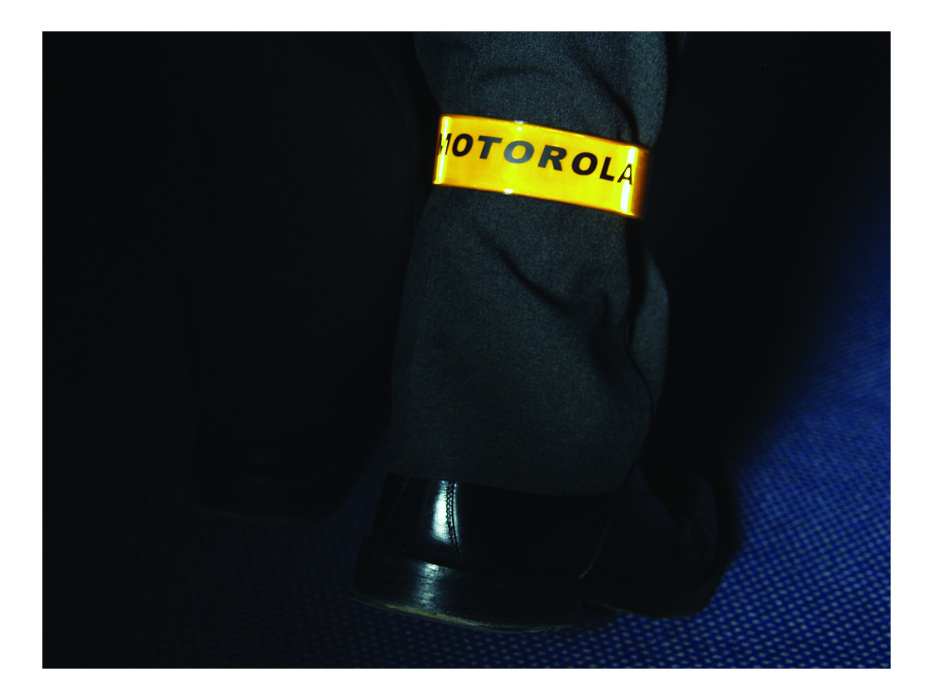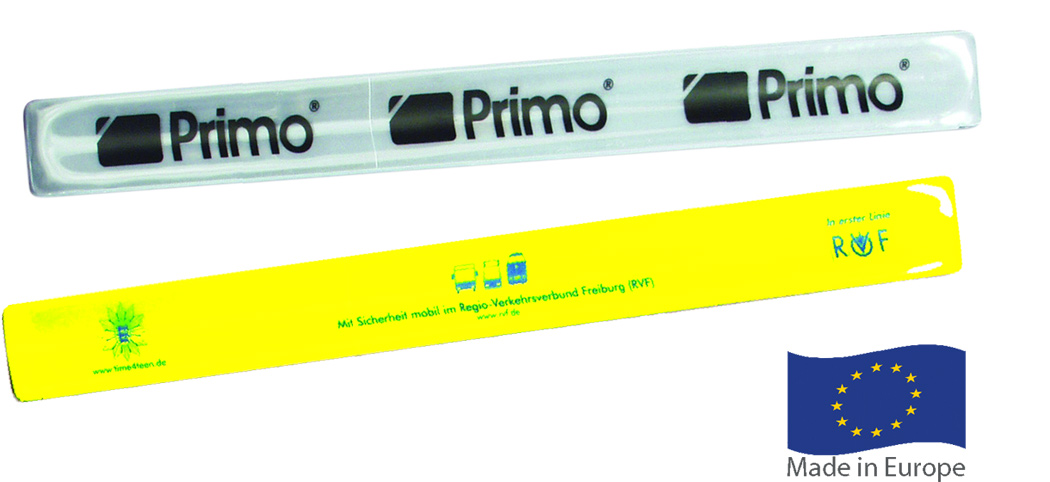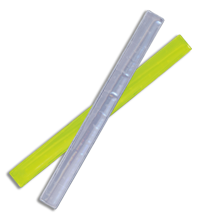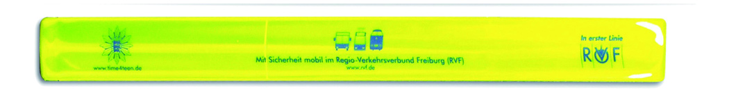 Reflektierende Schnappbänder. Möglichst nur kleine, feine Motive aufdrucken, um den Reflektoreffekt bestmöglich zu erhalten. Alternativ: Druck unter der Reflektorfolie mit dezentem Werbeeffekt. Wir empfehlen auf beiden Körperseiten ein Schnappband zu tragen, um den Reflektoreffekt aus nahezu jedem Sichtwinkel zu erreichen.