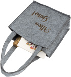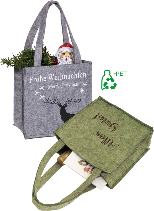 Die beliebte Tasche aus 100% rPET Filz ist vielseitig gestaltbar. Unterschiedliche Größen und Ausführungen sind auf Anfrage möglich, z.B. als Geschenktasche, zur Aufbewahrung oder zum Shoppen.