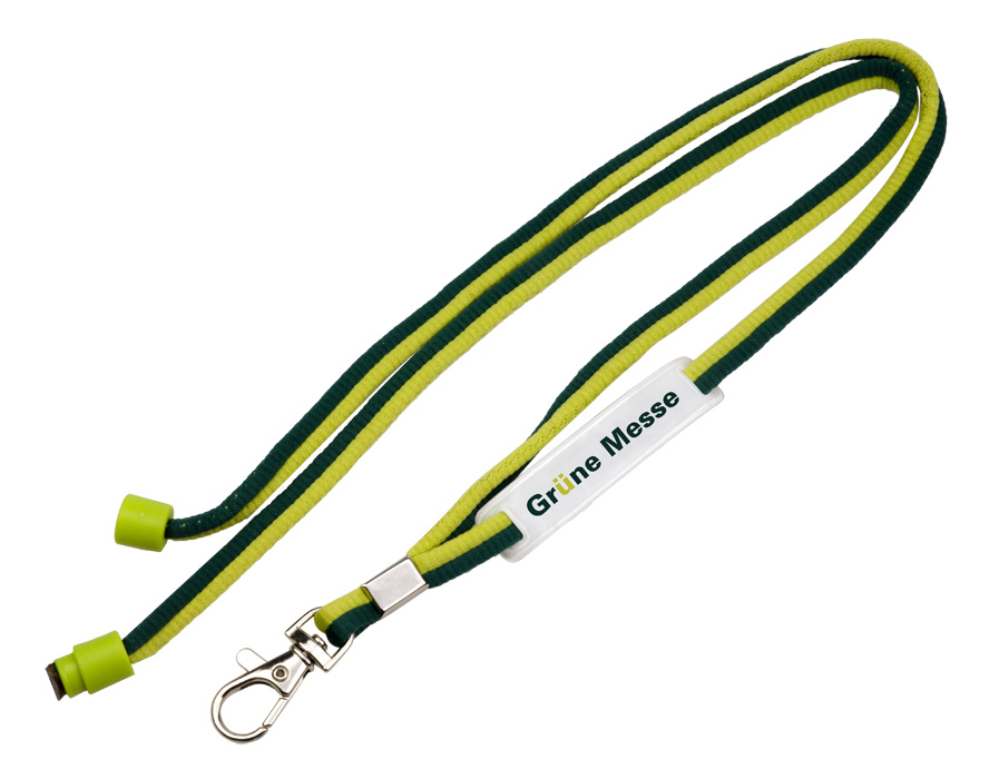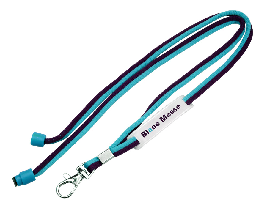 Das rundgewebte Polyesterband besteht aus zwei Strängen, die jeweils farbig nach Pantone in Wunschfarben gestaltet werden können. Die Motivanbringung erfolgt per Druck auf einem PVC-Label. Alternativ mit 2D gestaltetem Soft-PVC Label auf Anfrage. Empfehlung: für die größtmögliche Sicherheit empfehlen wir die Verwendung eines Sicherheitsverschlusses